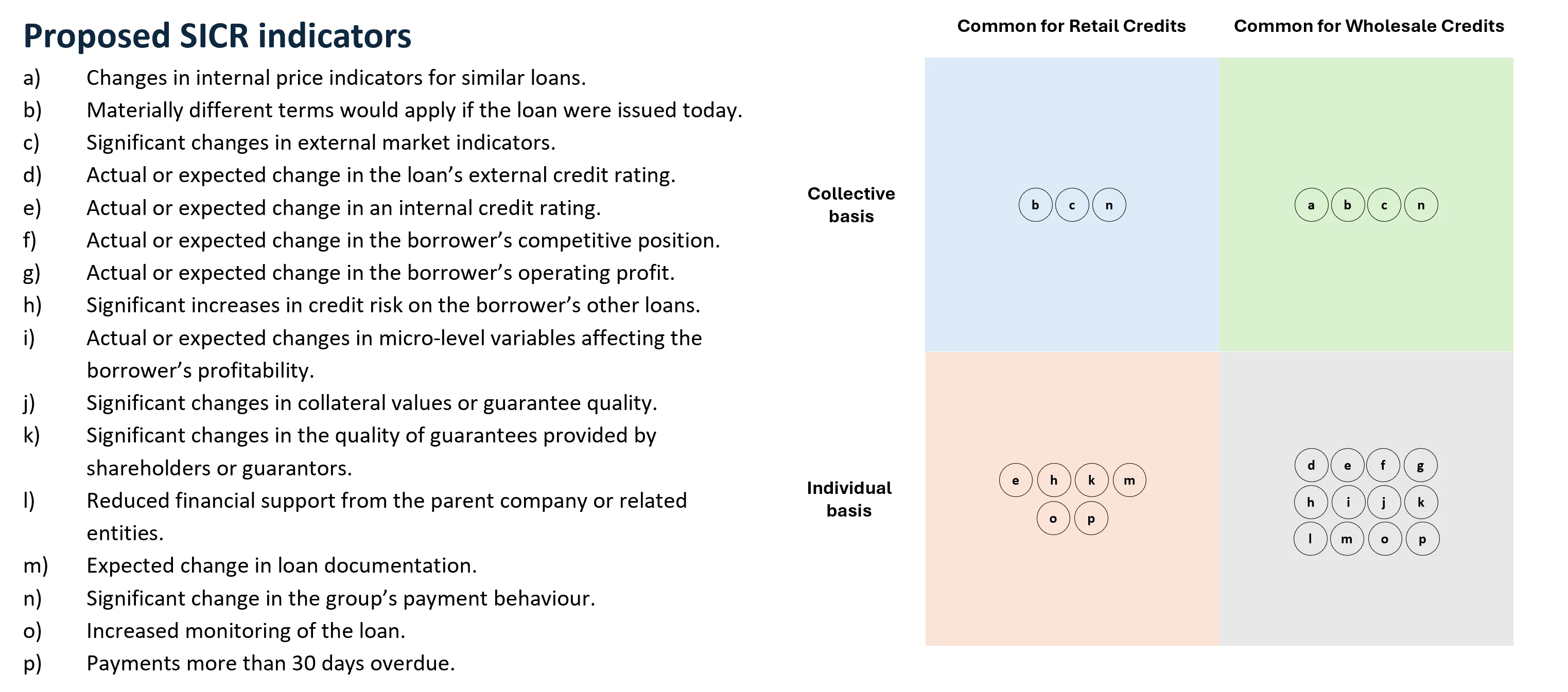Where readily available and reliable information is available to indicate the SICR, it shall be used. In the first instance, factors on an individual instrument basis should be considered, but if an institution does not have information available on an individual basis, the assessment of SICR should be made on a collective basis. The standard does not specify which indicators of SICR should be used, except for a rebuttable presumption that it is indicated by contractual payments being more than 30 days late. According to EBA/GL/2017/06, the 30-day criterion should not be used as a primary indicator of the SICR, but it is not excluded as a backstop to complement other forward-looking indicators. EBA report, as of December 2018, only 19% of the banks surveyed reported using the 30-day criterion as a backstop. Article B5.5.17 of IFRS 9 also proposes 16 additional indicators for SICR. EBA/Rep/2023/36, cites applications for credit relief measures, as well as whether the customer is on a watch list, as the most common ways in which qualitative information is included in the assessment of the SICR. The Global Public Policy Committee (GPPC) suggests in its guide for the implementation of IFRS 9 that it may be appropriate to apply a probationary period for certain qualitative indicators, such as for forbearance and delays.